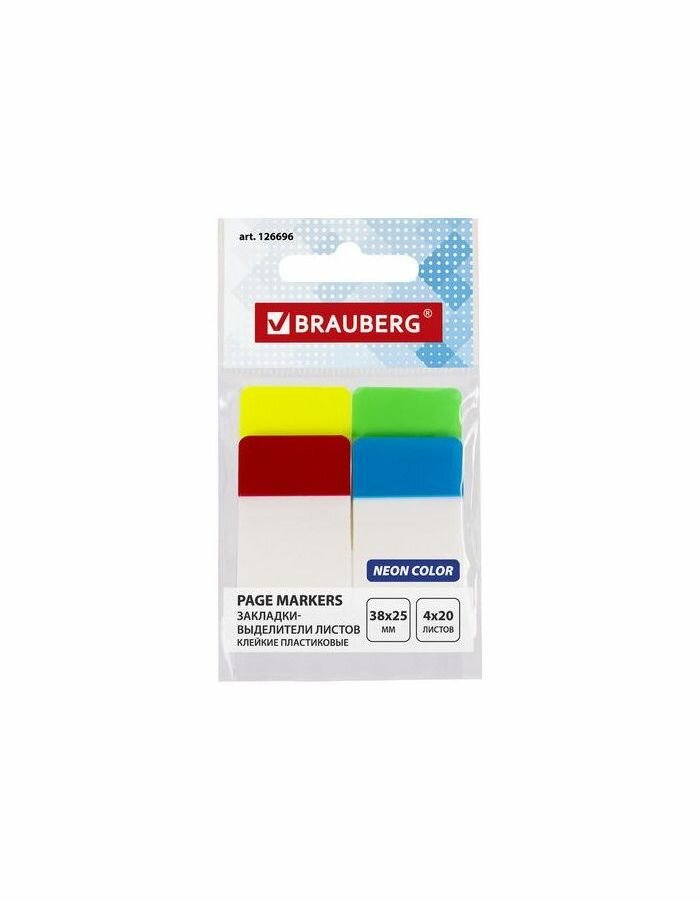 Закладки-выделители листов клейкие BRAUBERG, пластиковые, 38х25 мм, 4 цв. х 20 л., 126696