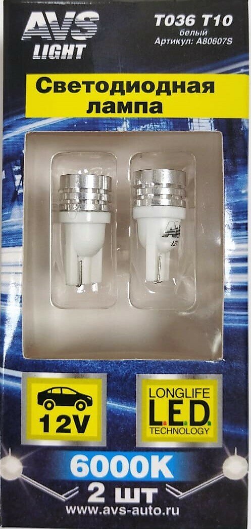 Лампа автомобильная светодиодная AVS A80607S (T10 T036 /белый/ (W2,1x9,5d) 1W W5W, блистер, 2 шт)