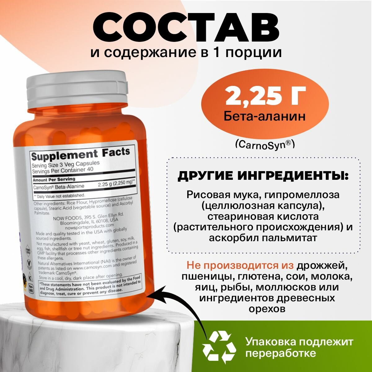 Аминокислота NOW Beta-Alanine, нейтральный, 120 шт.