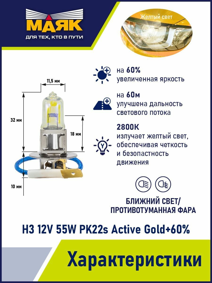Лампа 12v H3 55w +60% Pk22s Маяк Active Gold 2 Шт. Duobox 72320ag+60 Маяк арт. 72320AG60