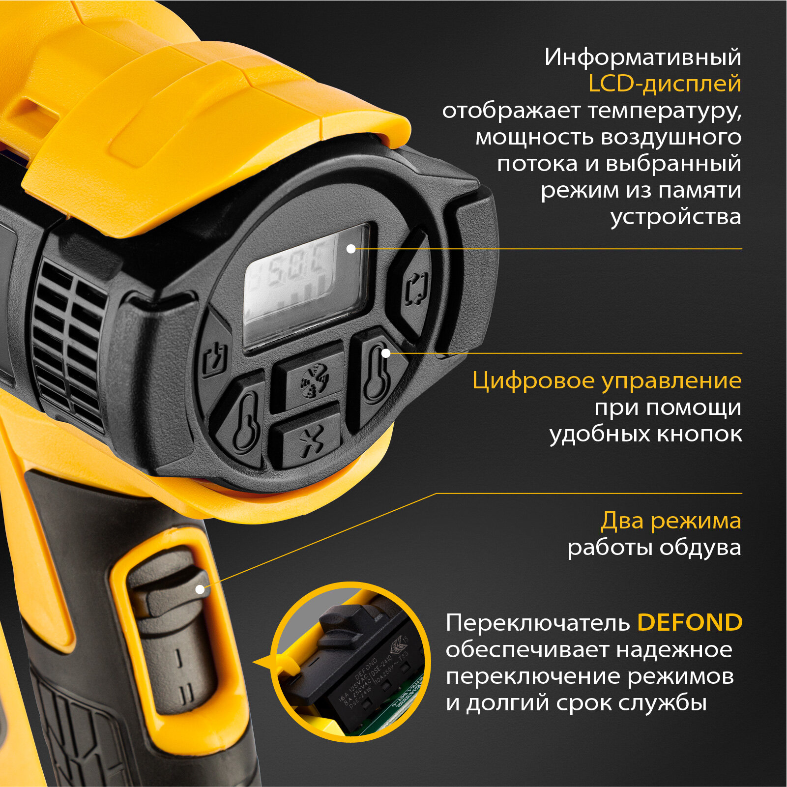 2 режима работы; функция памяти; датчик обратной связи; кабель питания с резиновой изоляцией 3 м; в комплекте: фен технический, кейс, комплект дополнительных насадок (плоская, полукруглая, отражающая округлой формы, редукционная), треугольный скребок, инструкция, гарантийный талон
