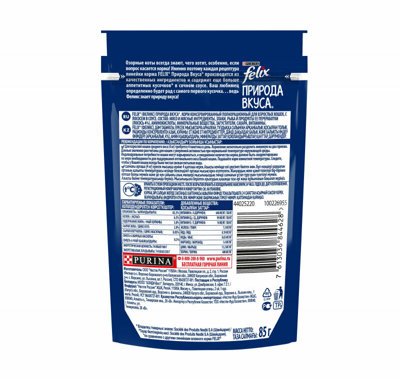| Отзыв: | паучи имеют насечку, чтобы можно было открывать без ножниц. срок годности – 12 месяцев, тоже здорово! в день уходит по одному пакету. кот ест прекрасно |
