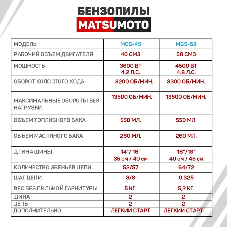 Ниже Вы можете прочитать отзывы на Бензопила/пила цепная бензиновая Matsumoto MGS-58/4500вт, 2шины+2цепи,масло, ознакомится с подробными характеристиками, посмотреть интересные обзоры и фотографии на Бензопила/пила цепная бензиновая Matsumoto MGS-58/4500вт, 2шины+2цепи,масло.