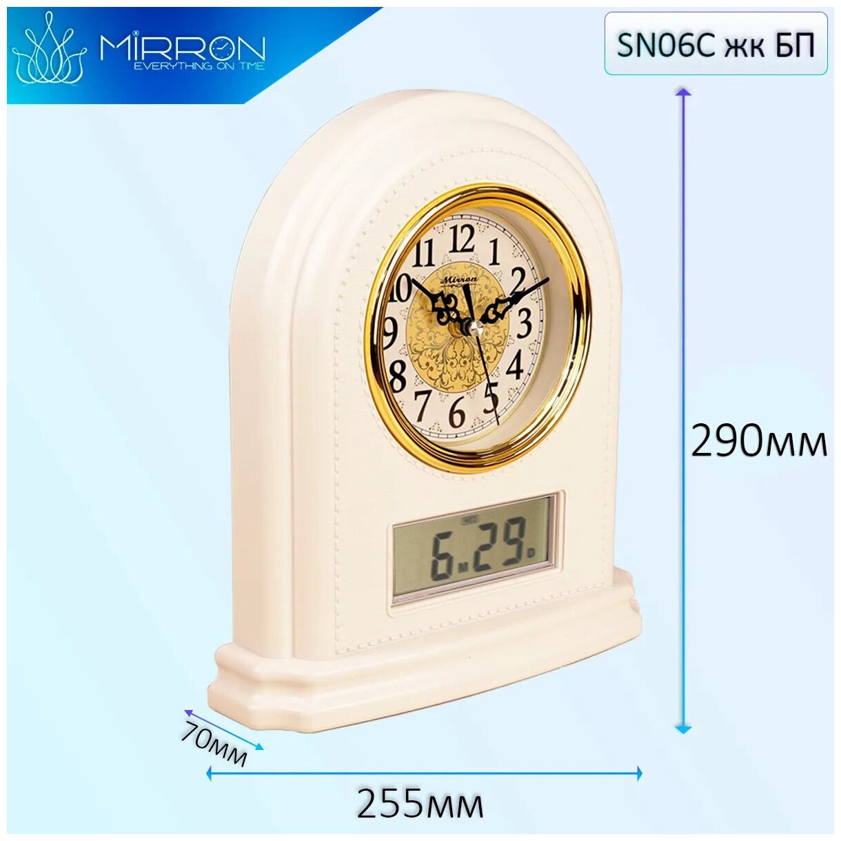 Классические настольные часы с ЖК дисплеем SN06C ЖК БП/Белый (перламутровый) цвет корпуса/Золотой ободок циферблата/Светлый циферблат/Арабские цифры/Часы с датой/Каминные часы/Металлический циферблат