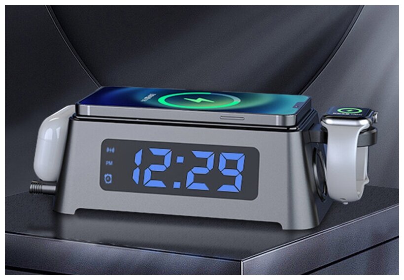 | Плюсы: | Универсальность. Заряжает реально телефон, часы и наушники. Все это работает. Часы яркие, можно делать тусклее для ночи. |