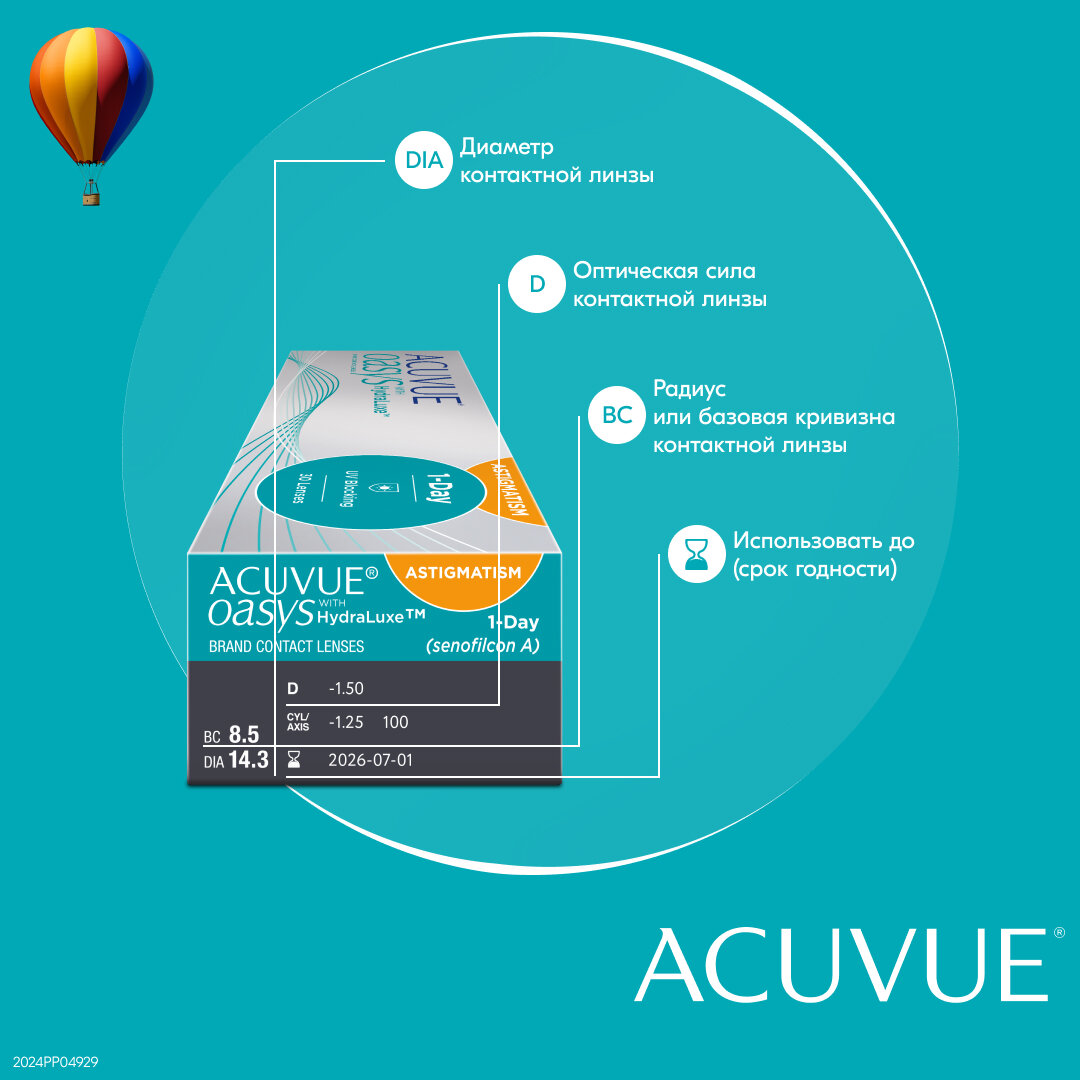 Астигматические линзы ACUVUE OASYS 1-Day with HydraLuxe for Astigmatism (30 линз) Ось 20, Оптическая сила цилиндра -1.25 -6.00 R 8.5, однодневные, прозрачные