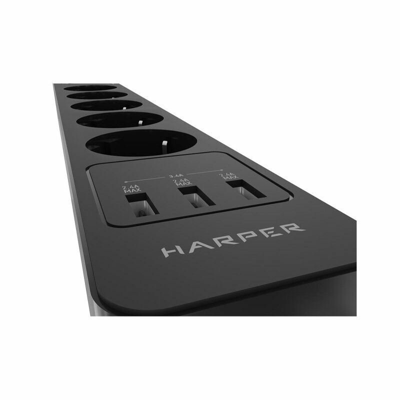 Сетевой фильтр 3.0м черный Harper UCH-560 Black 3xUSB порта, 5 розеток, 4000W 16A