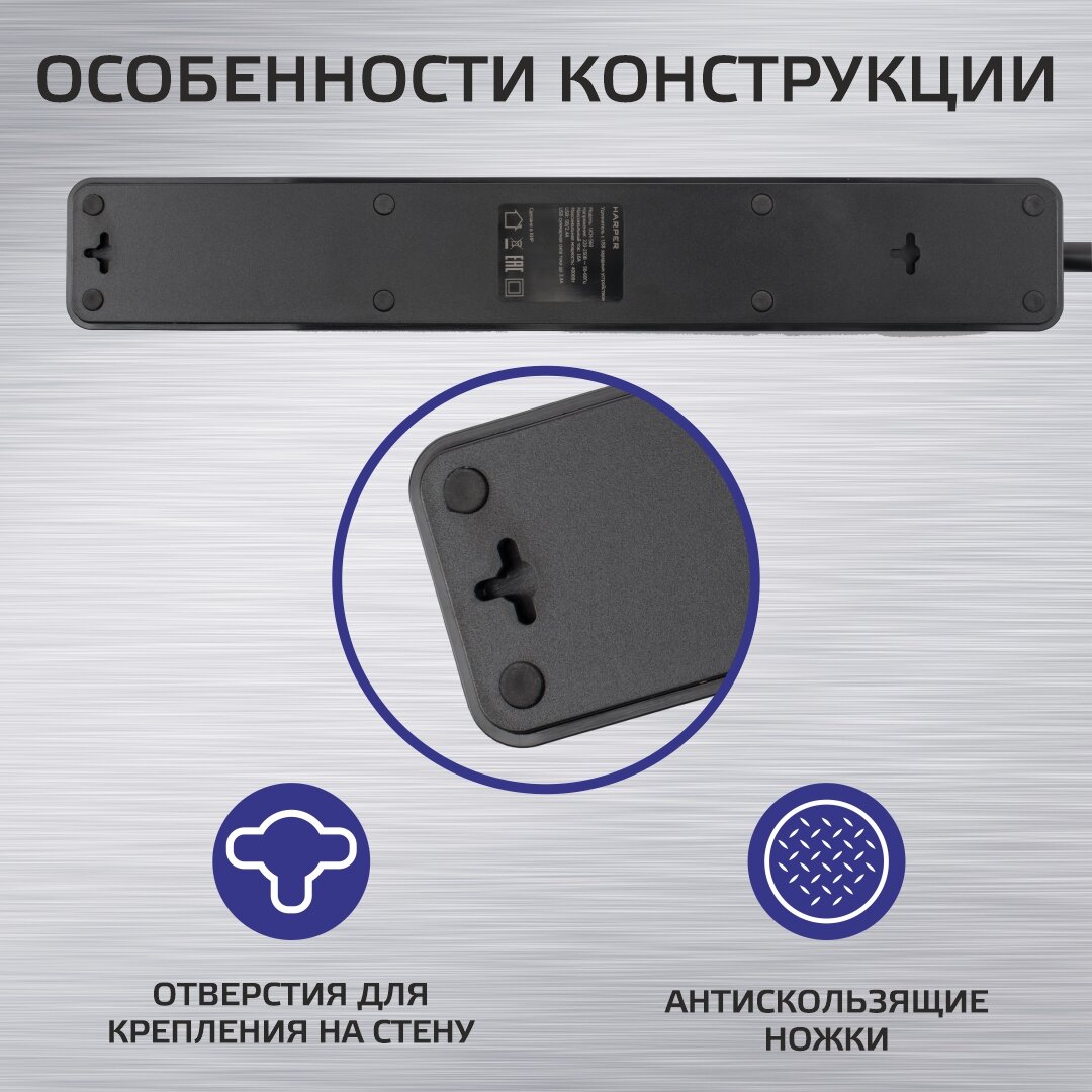 Сетевой фильтр (удлинитель) с USB зарядкой HARPER UCH-560 черный