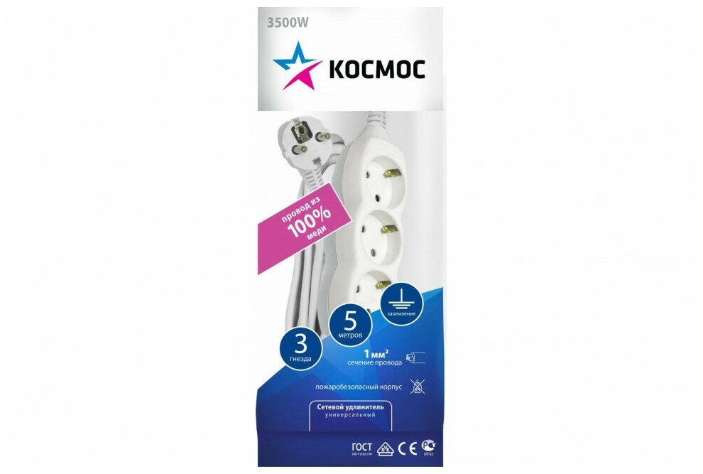 Купить Удлинитель Космос 5 метров, 3 гнезда, 16А, ПВС 1мм.