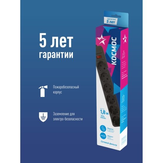 Купить Сетевой фильтр Космос Электро Космос 6х1.8м с заземл. 16А IP20 3.5кВт с пред. 3х1 индик. сети, черный, FKsm1.8m-6g(B)16A