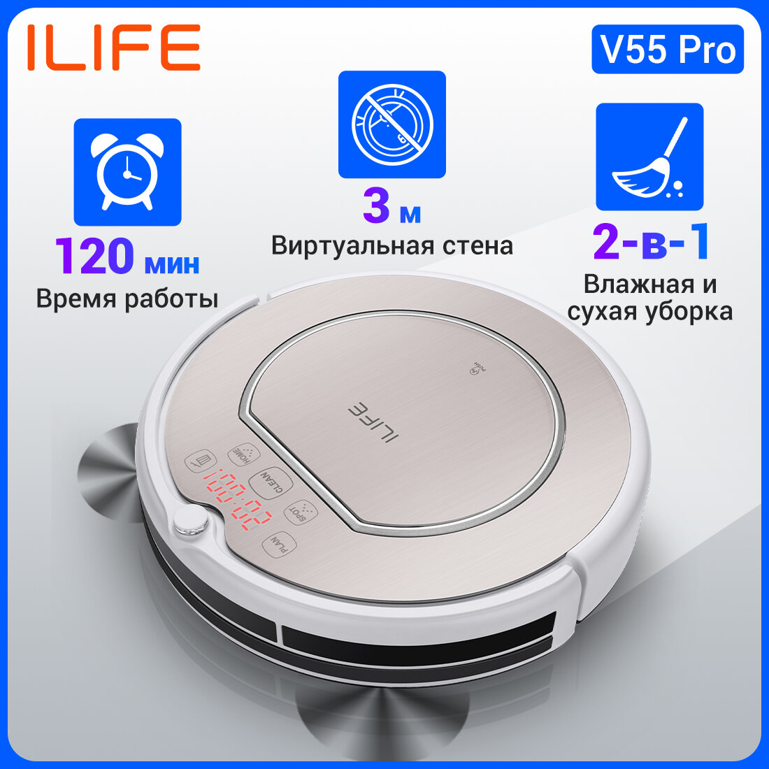 Робот пылесос ILIFE V55 Pro с влажной и сухой уборкой дома, 2600 мАч, виртуальная стена, с LED дисплей, серый интересное: