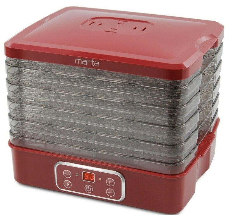 Сушилка идеально подошла для семьи из пяти человек. Множество поддонов позволяет сушить разные ягоды одновременно. В книге рецептов не нашла необходимое (сушила шелковицу) но на ютубканале Marta очень много рецептов и вариантов сушки! После приобретения сушилки советую посмотреть. Качественные материалы гарантируют безопасность и сохранение всех полезных веществ!