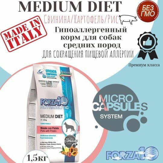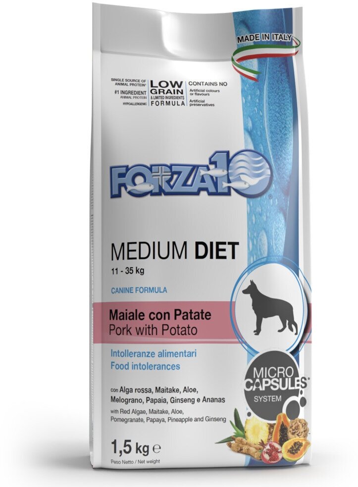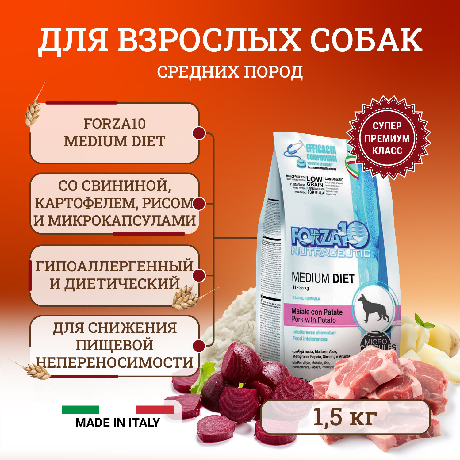 Сухой корм Forza10 Medium Diet для взрослых собак средних пород, со свининой, картофелем с микрокапсулами, 1,5 кг
