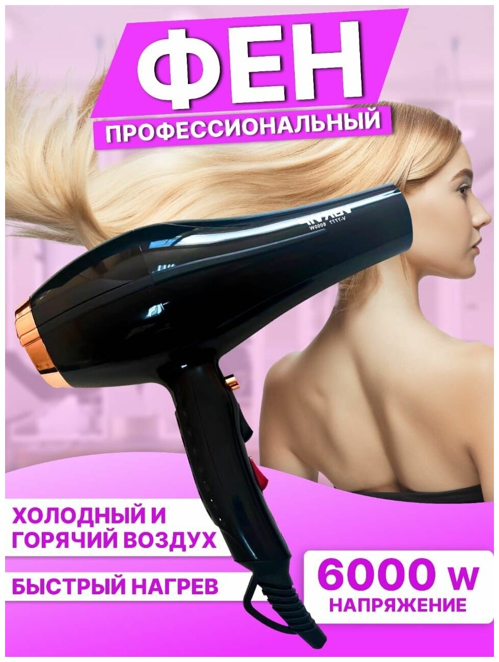 Купить AV-Retail / Профессиональный фен для волос 6000Вт / 3 ступенчатая регулировка температуры