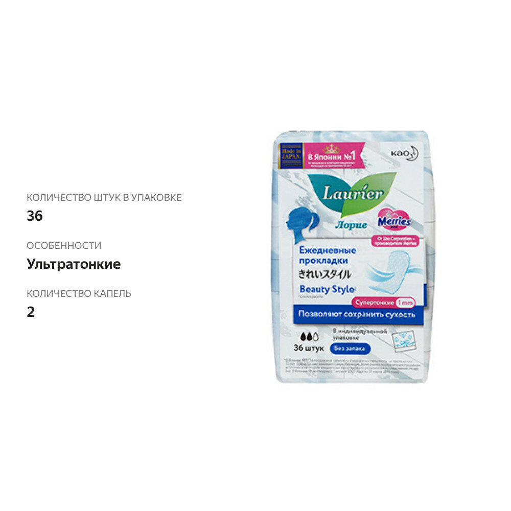 Гигиенические прокладки Merries Laurier Beauty Style на каждый день без запаха 36 шт 424578/558638/550367