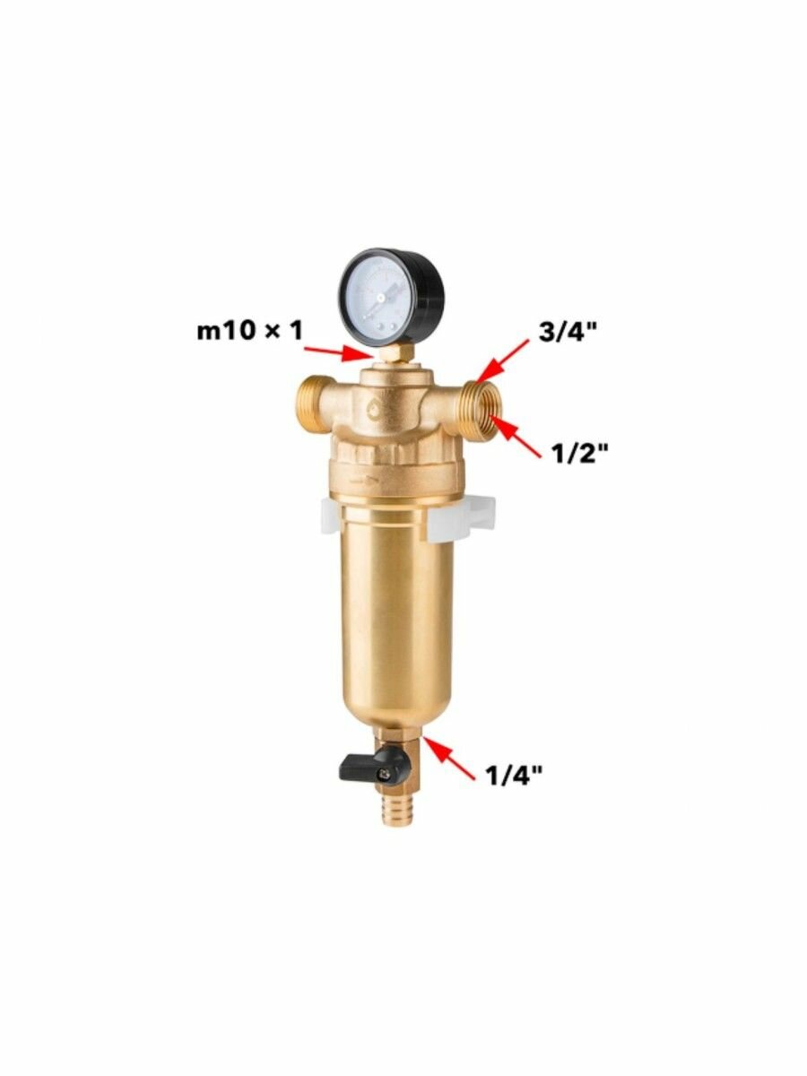 Магистральный фильтр для горячей воды самоочищающийся промывной латунный 1/2", 100 микрон, с манометром AV Engineering (AVE115701)