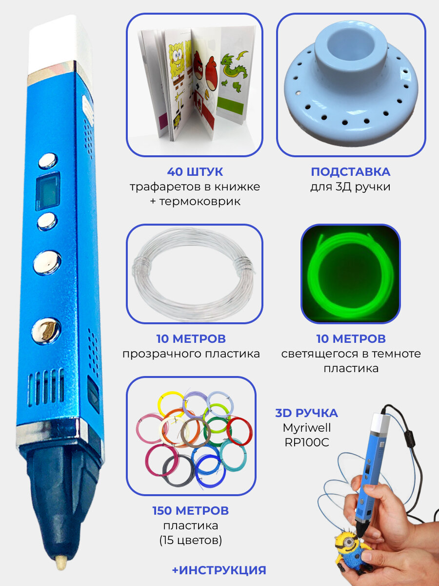 3Д ручки Myriwell 3D ручка Myriwell RP100С + 170 м пластика + книжка с трафаретами + подставка (Голубой) интересное: