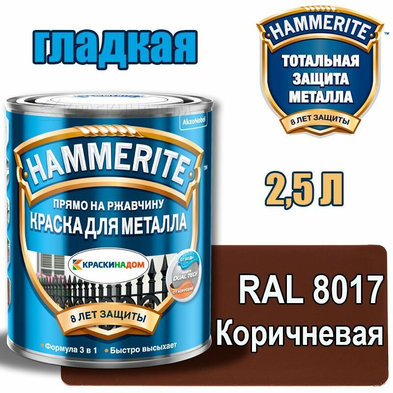Купить Краска по металлу Hammerite гладкая, глянцевая (2,5л) коричневый (RAL 8017)