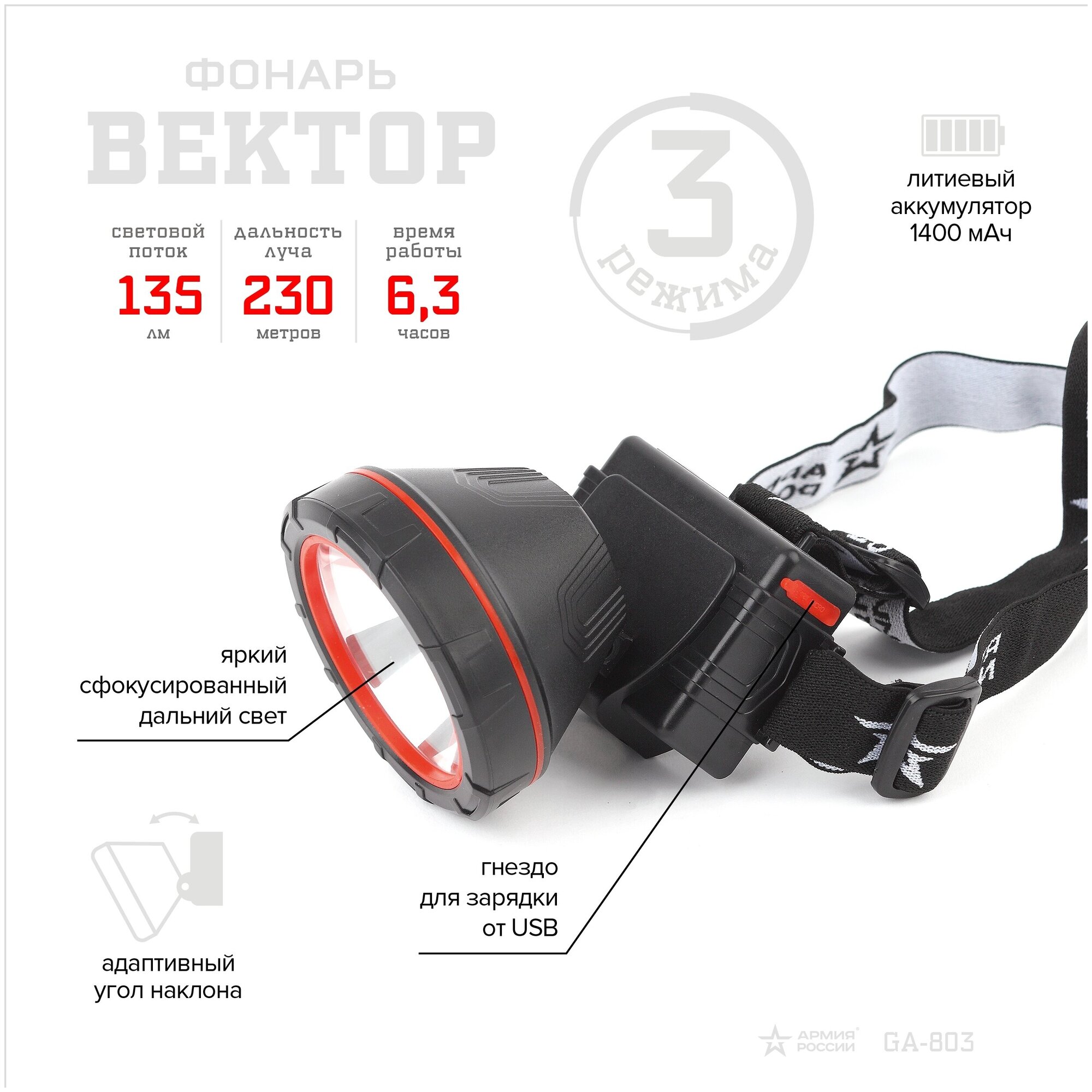 Фонарь налобный армия россии GA-803 АР Вектор [5Вт, литий, USB]