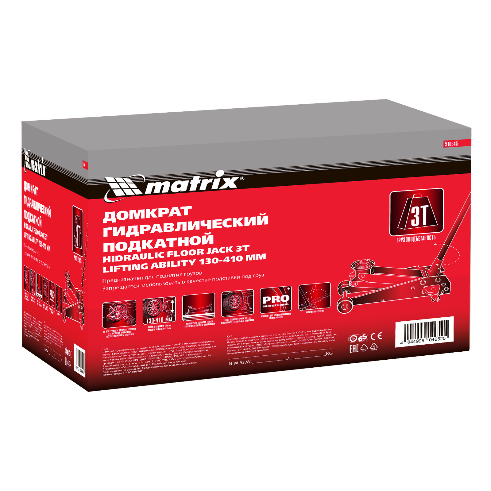 Домкрат гидравлический подкатной Matrix 3 т, h подъема 130–410 мм, поворотная ручка, 510345