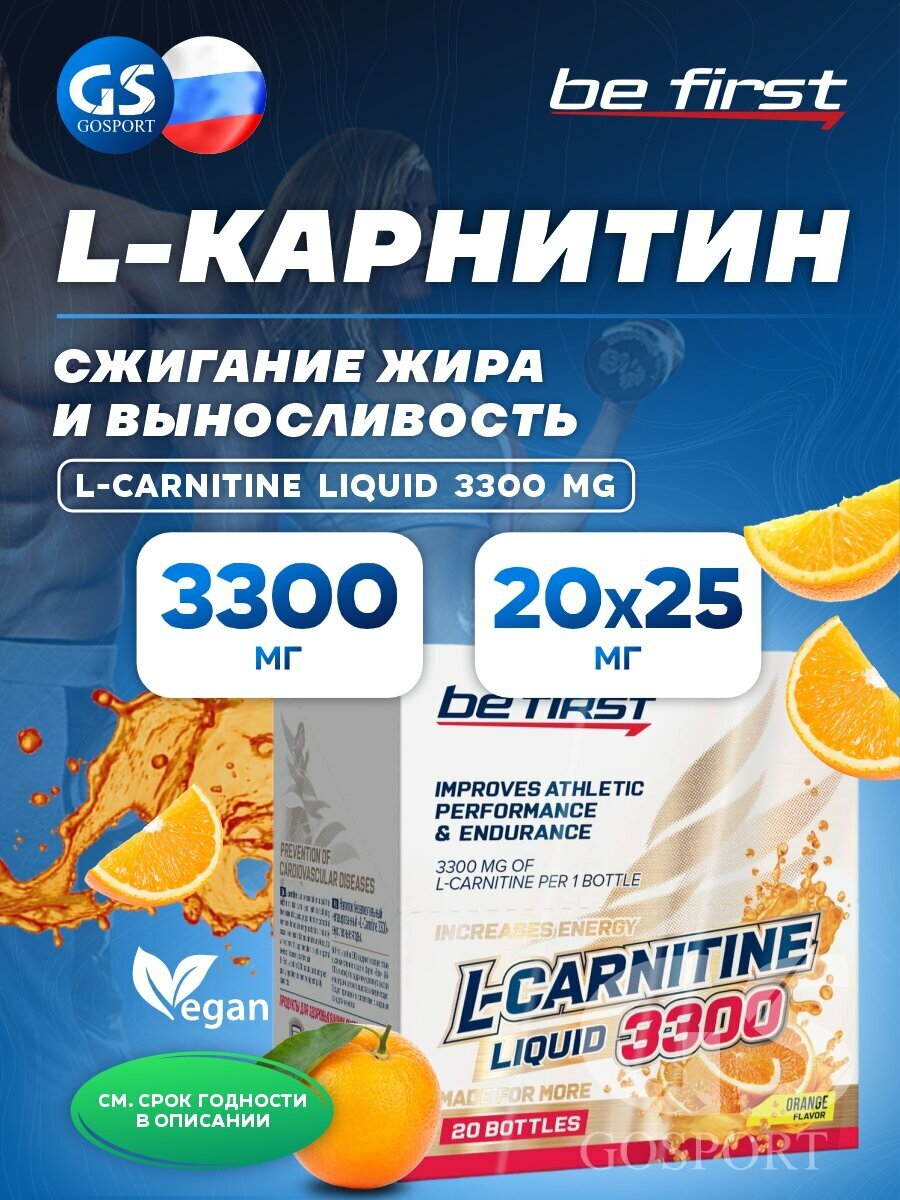 (20 Ампул) Be First L-carnitine 3300 жидкий концентрат в ампулах, л карнитин для похудения (Апельсин)