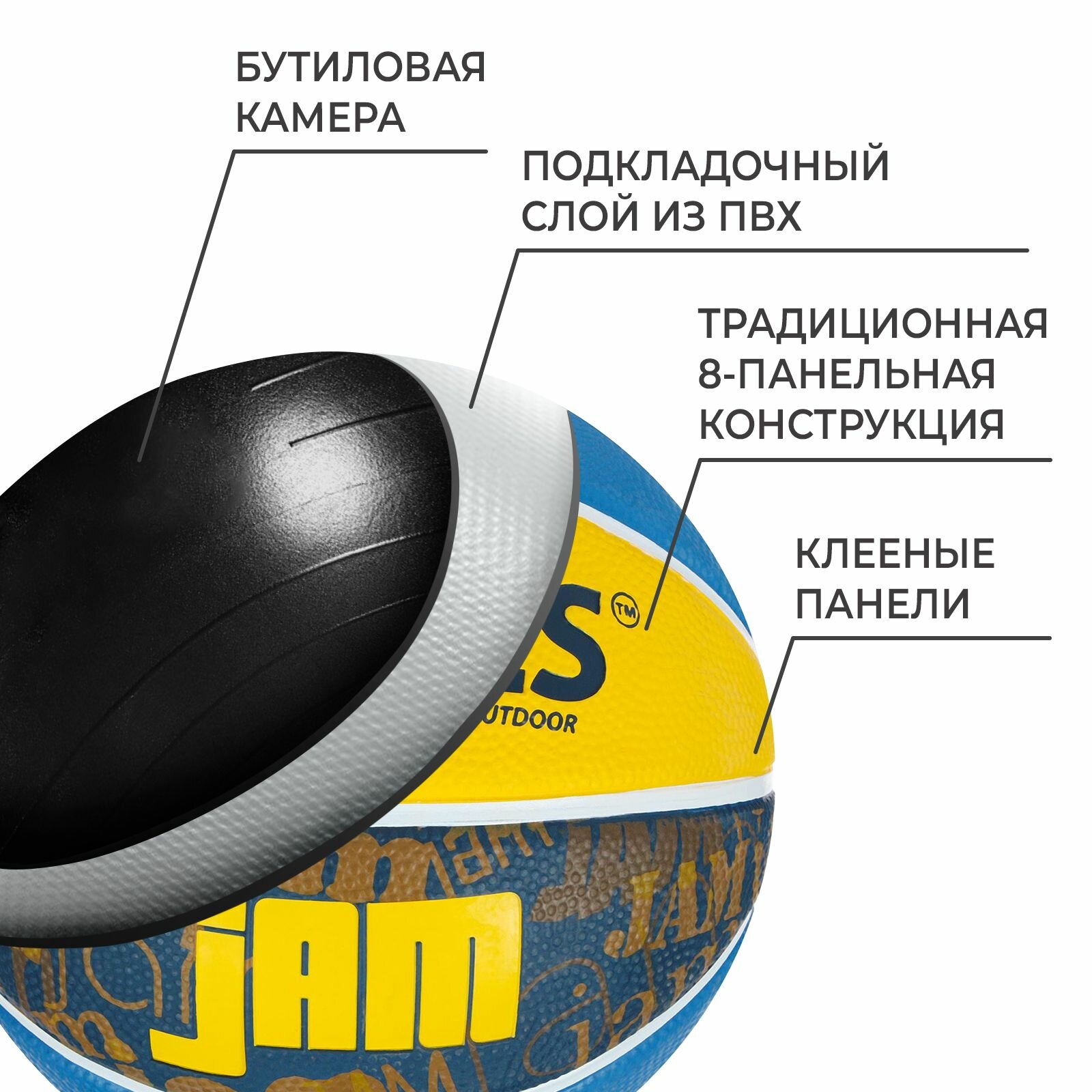 Баскетбольный мяч TORRES Jam, B02043, клееный, 8 панелей, р. 3, резина, бутиловая камера