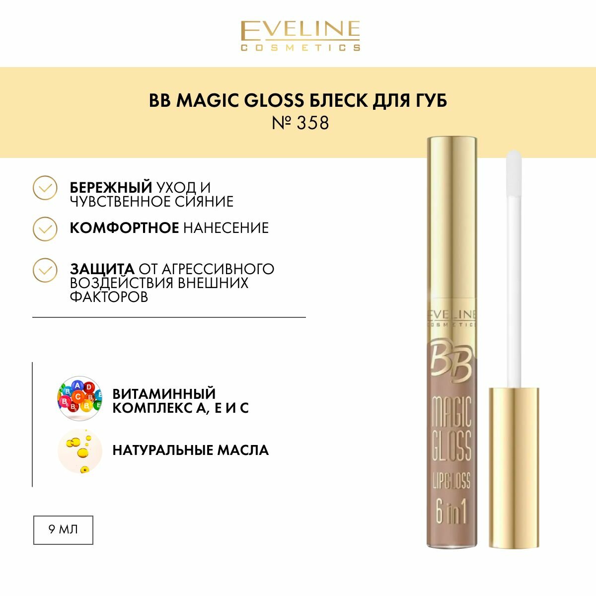 Eveline Cosmetics / Эвелин Косметикс Блеск для губ BB Magic Gloss Lipgloss 6 в 1, тон 358 нюдовый, 9мл / декоративная косметика