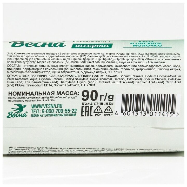 Мыло Весна, Ассорти алоэ и овсяное молочко, 90 г