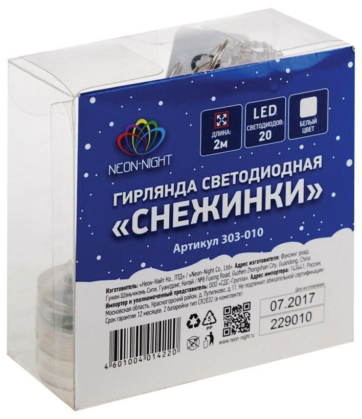 Гирлянда светодиодная "Снежинки" 2м 20LED бел. 2Вт 4.5В IP67 провод прозр. элементы питания 2хCR2032 (в компл.), NEON-NIGHT 303-010 (1 шт.)