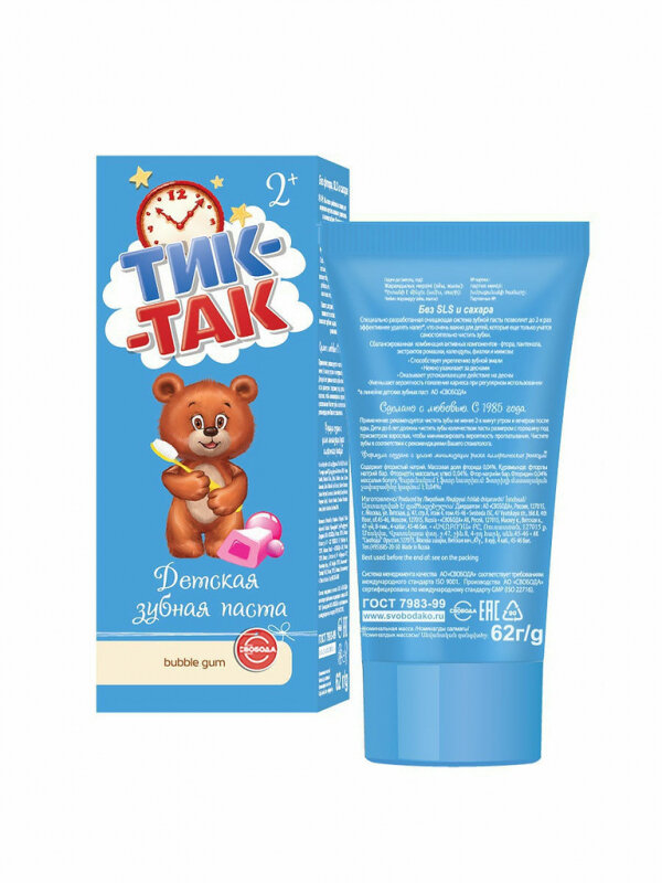 Зубная паста свобода Тик-Так bubble gum 2+, 62 мл, 62 г