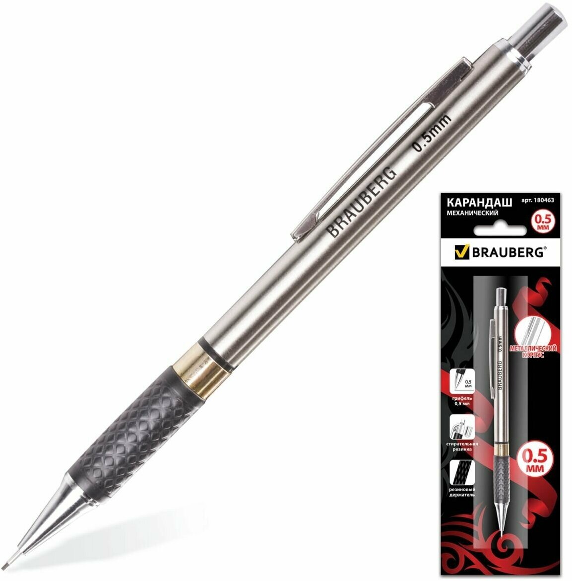 Карандаш механический 0,5 мм, BRAUBERG "Black Jack", металлический корпус, ластик, резиновый грип, 180463 (цена за 1 ед.товара)