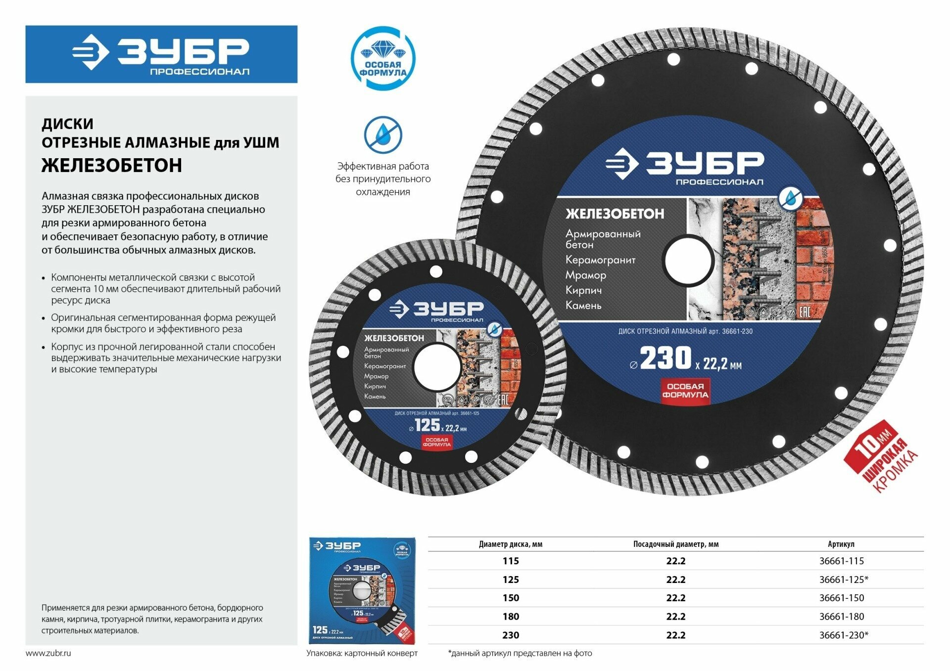 Железобетон 230 мм, диск алмазный отрезной сегментированный по железобетону, 36661-230 армированному бетону, ЗУБР Профессионал