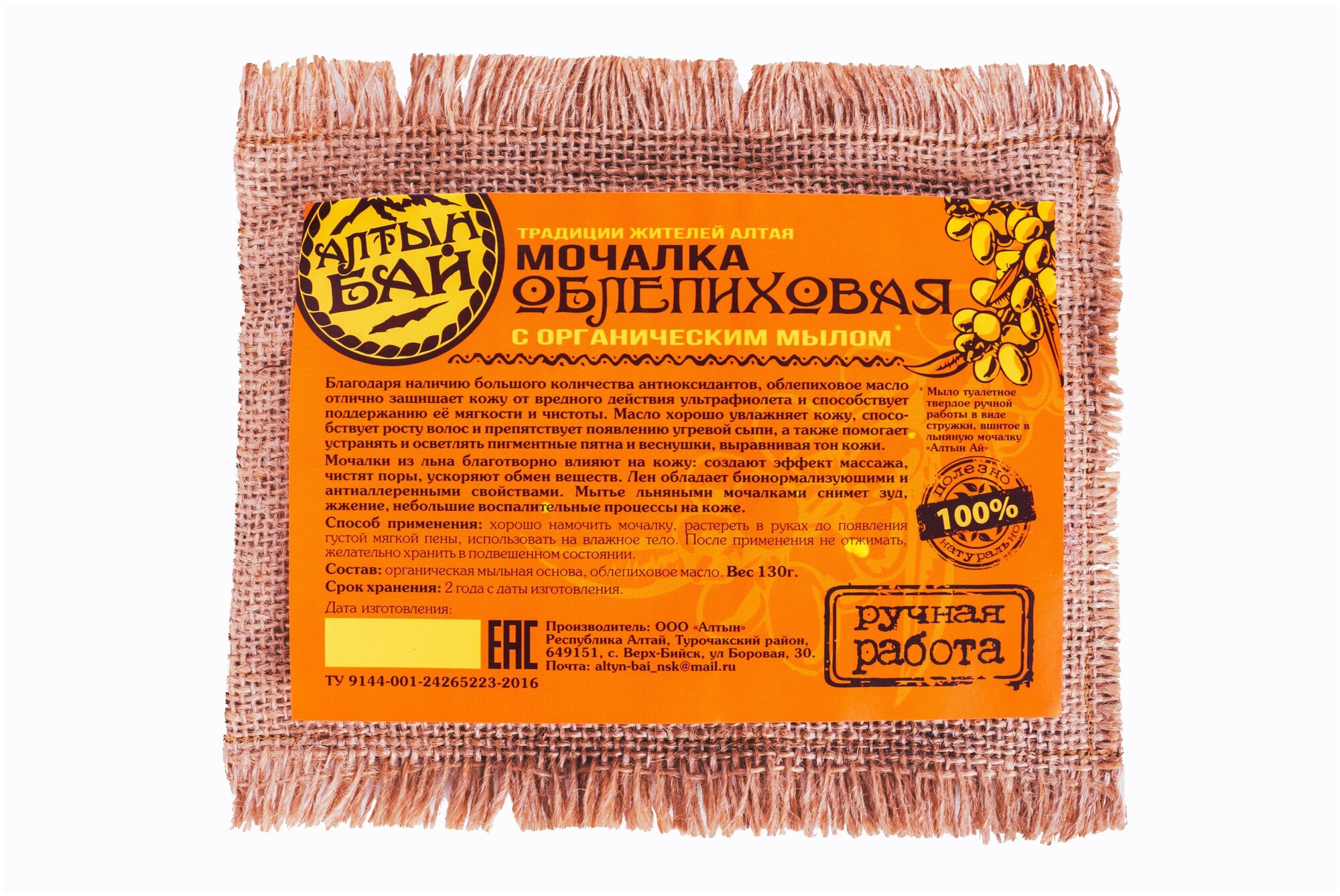 Мочалка льняная с органическим мылом облепиховая, 130 г АлтынБай