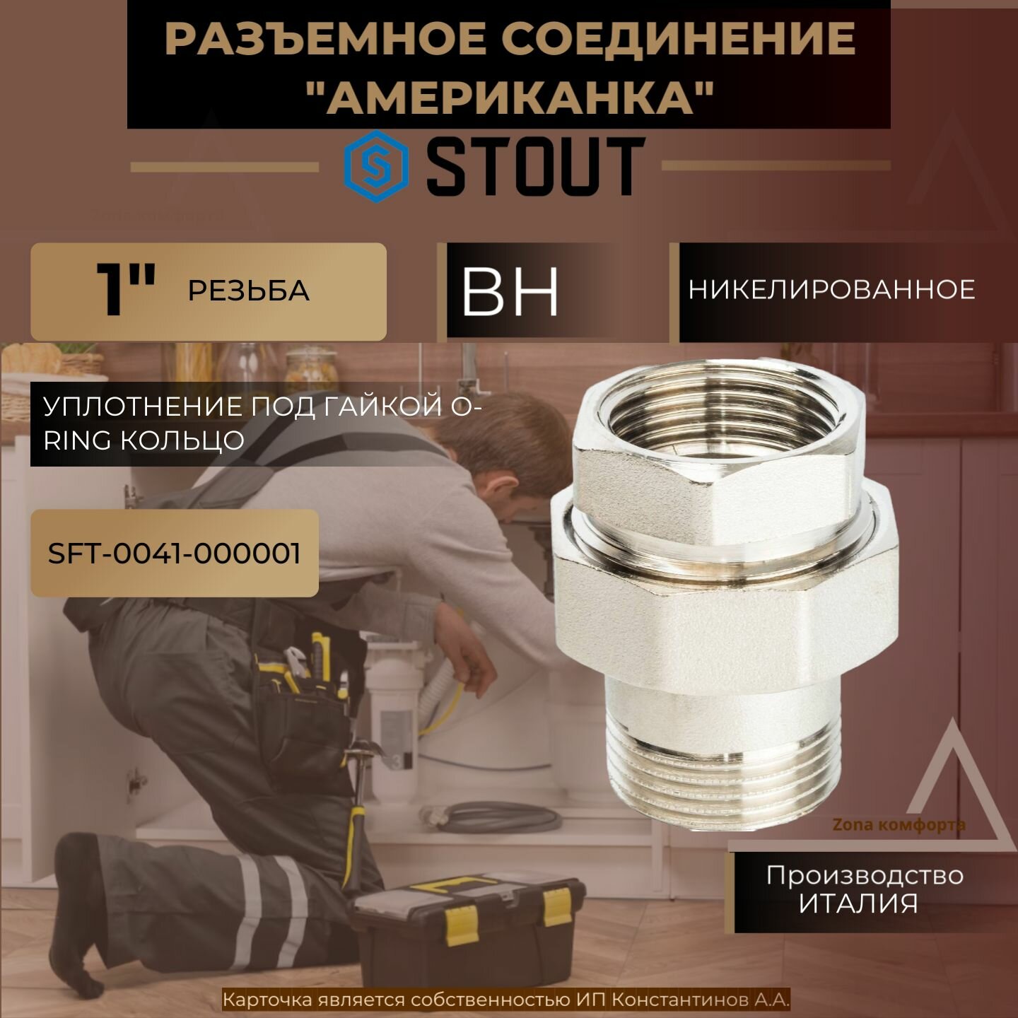 SFT-0041-000001 STOUT Разъемное соединение "американка" ВН никелированное, уплотнение под гайкой o-ring кольцо 1"