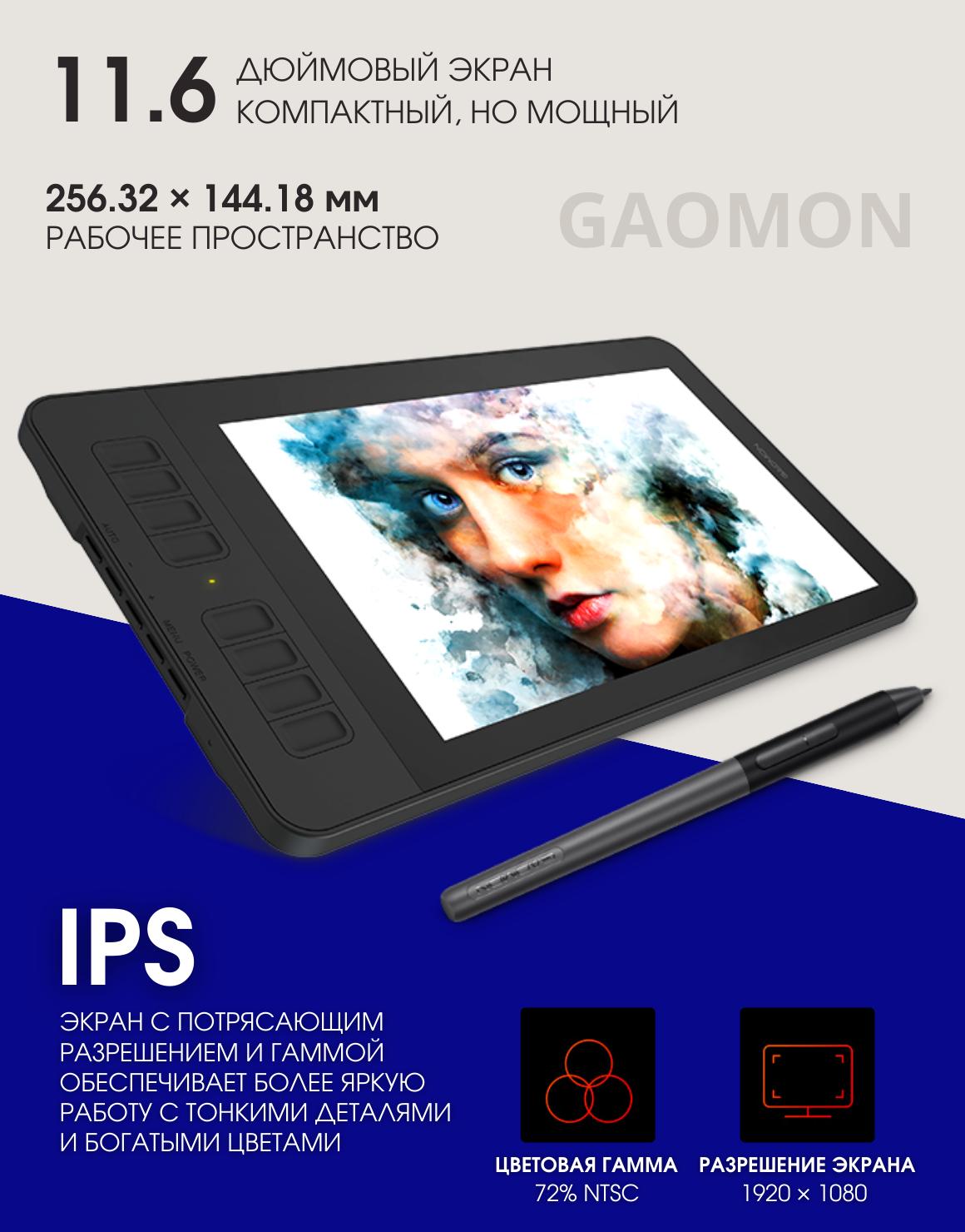 Графический планшет для рисования GAOMON PD1161, 11.6", 256х144 мм, 1920x1080, черный