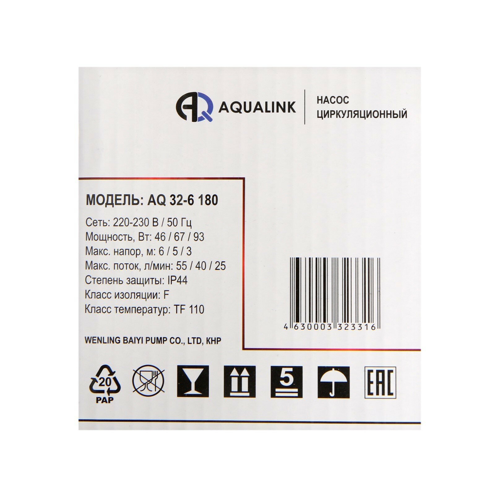 Насос циркуляционный AQUALINK 25-6 180, напор 6 м, 55 л/мин