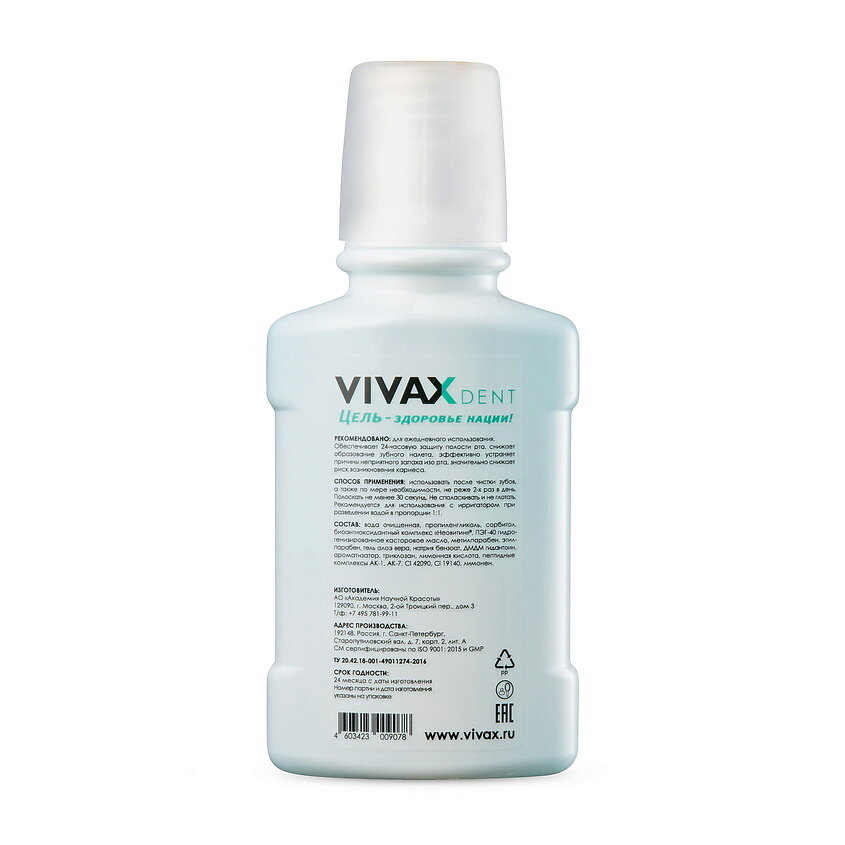 VIVAX Бальзам для полости рта с пептидным комплексом, Неовитином и Алоэ-Вера, 250 мл.