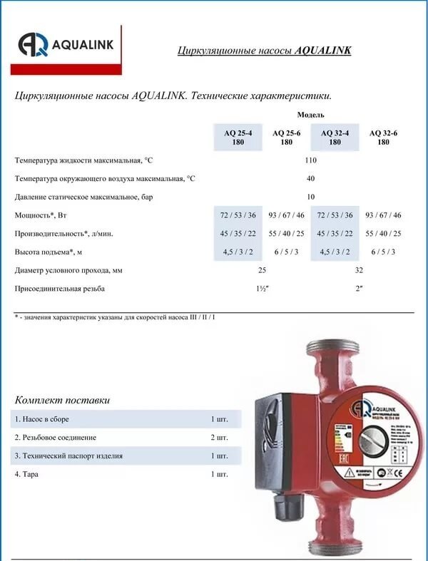 | Подробная комплектация | Насос, резьбовое соединение - 2шт, паспорт |