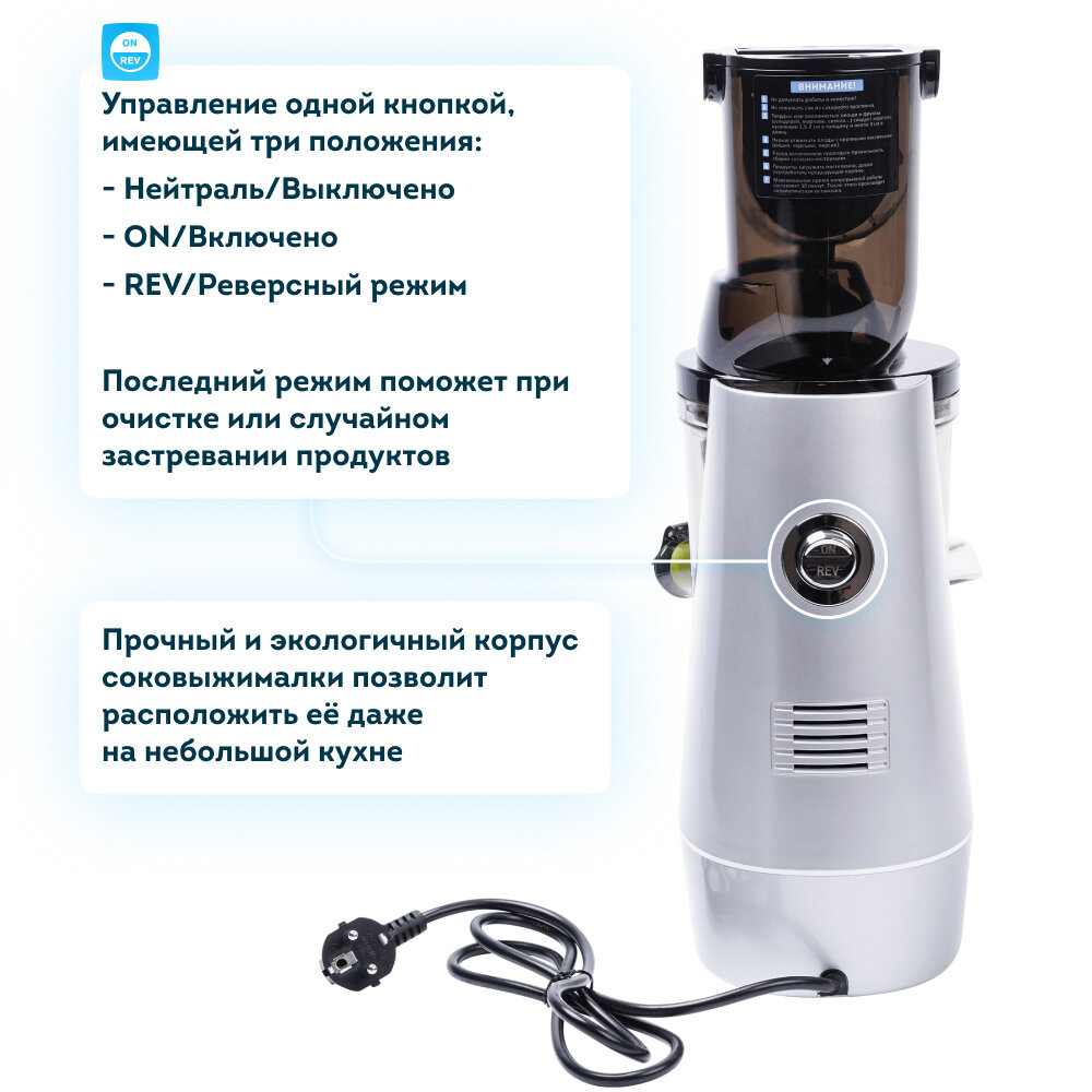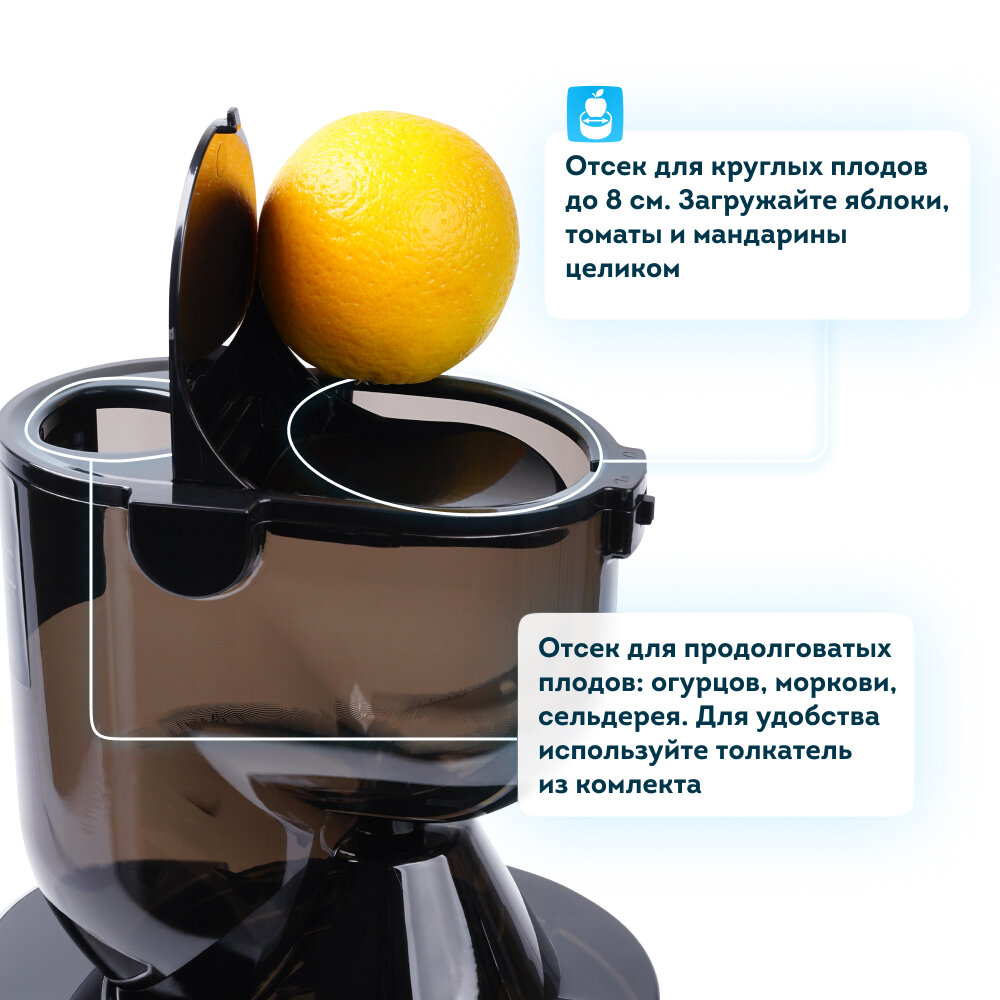 + безопасность загрузки продуктов. Разрешаем закидывать яблоки нашему 3-х летнему ребёнку, ему интересно, развлекается и мы не беспокоимся, т.к. в окно загрузки невозможно просунуть руку, тут всё продумано + многие продукты выжимает очень хорошо. Особенно классно получается сок из яблок, граната, персиков (из всего мягкого). Жмых выходит сухим, давить больше нечего |