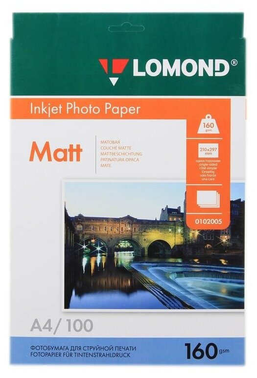 Фотобумага для струйной печати А4, 100 листов LOMOND, матовая, односторонняя, блок 160 г/м² (0102005)