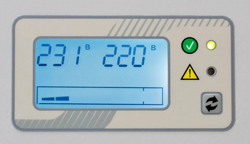 | Плюсы: | Идеально стабильное напряжение на выходе стабилизатора. Взял вариант исполнения на 230 Вольт - по показаниям мультиметра с выходных розеток всегда реально 229-231 Вольт, независимо от того, что на входе. Удивительно, но факт. При работе стабилизатор не издаёт ни каких звуков, кроме шума вентилятора системы охлаждения. Очень нравится дисплей аппарата - ЖК с возможностью отображения входного-выходного напряжения в реальном времени, нагрузки на стабилизатор и степени загрузки последнего, температура внутри аппарата, индикаторы работы, защиты и т.д. |
