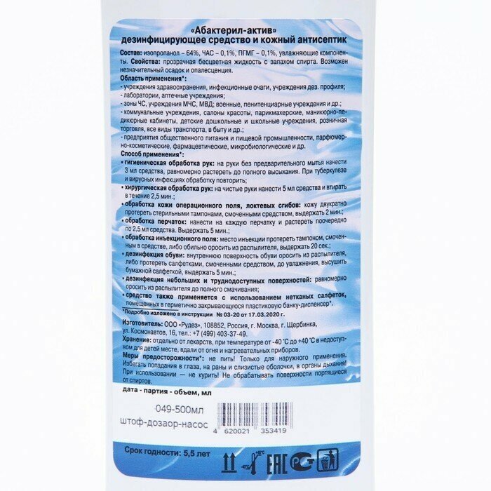 20 шт. Кожный антисептик с вирулицидной активностью ГОСТ 12.1.007-76 Абактерил-Актив 500 мл с насос-дозатором