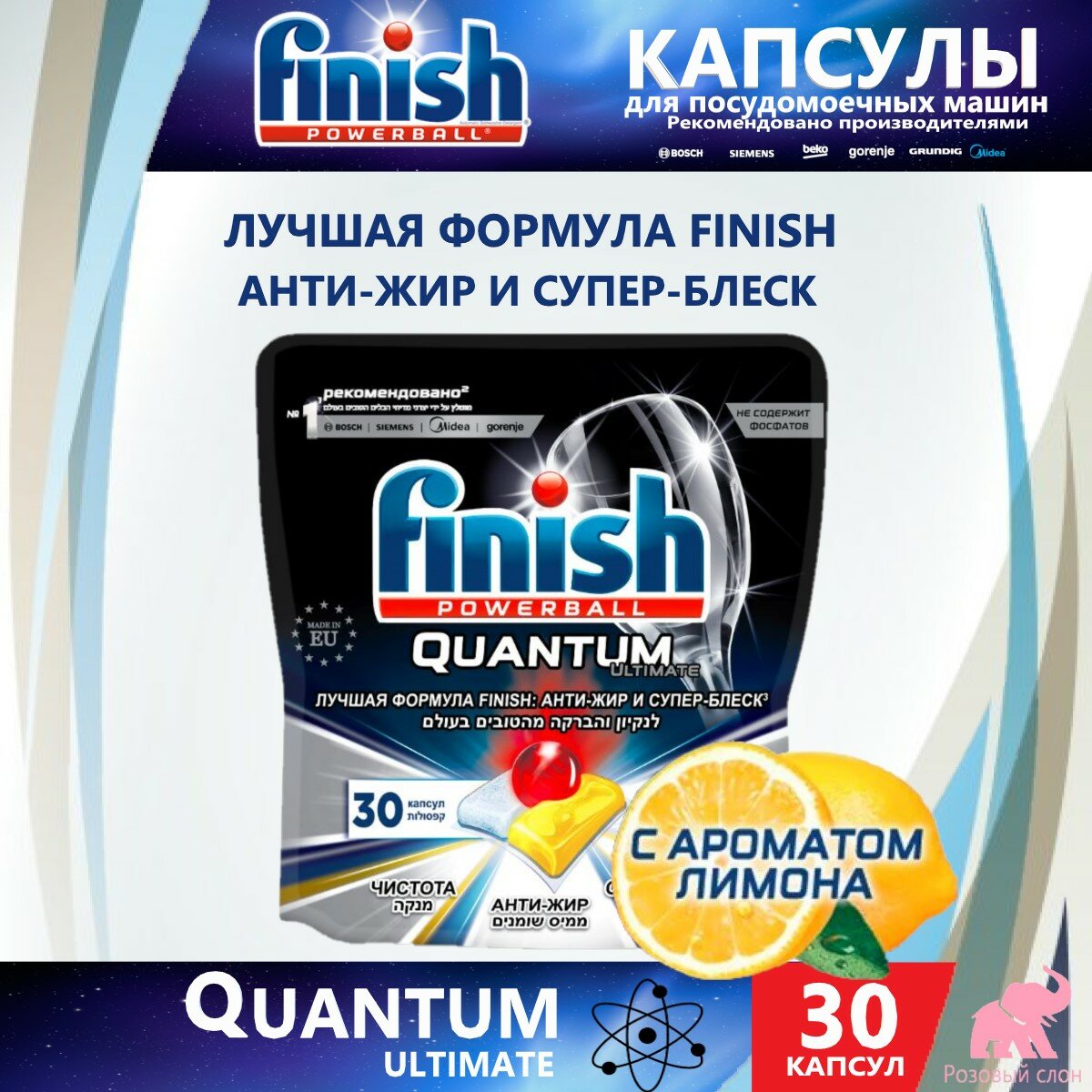 Капсулы для ПММ Finish Quantum Ultimate бесфосфатные"Лимон" дойпак 45 шт Finish 7152563 .