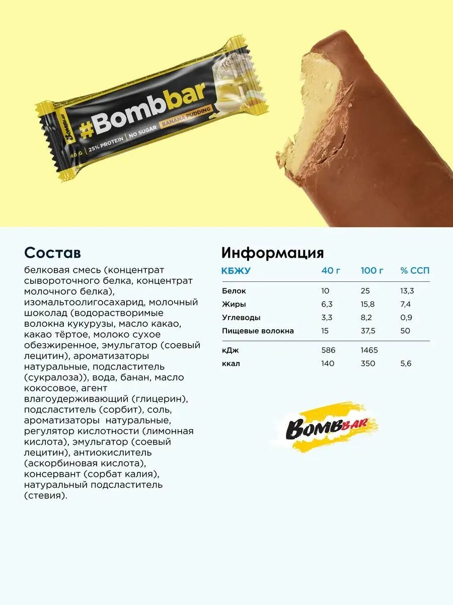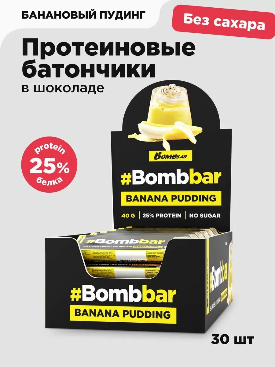 Протеиновый батончик Bombbar в шоколаде, Банановый пудинг, 40г х 30 шт.