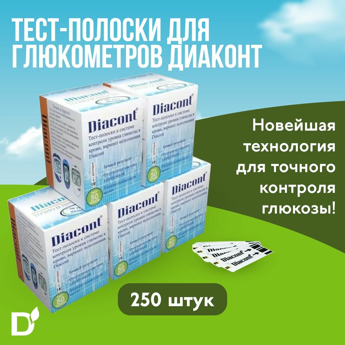 Тест-полоски для глюкометра Diacont (Диаконт), 250 штук (5 упаковок №50), измерение сахара в крови, мониторинг глюкозы при диабете