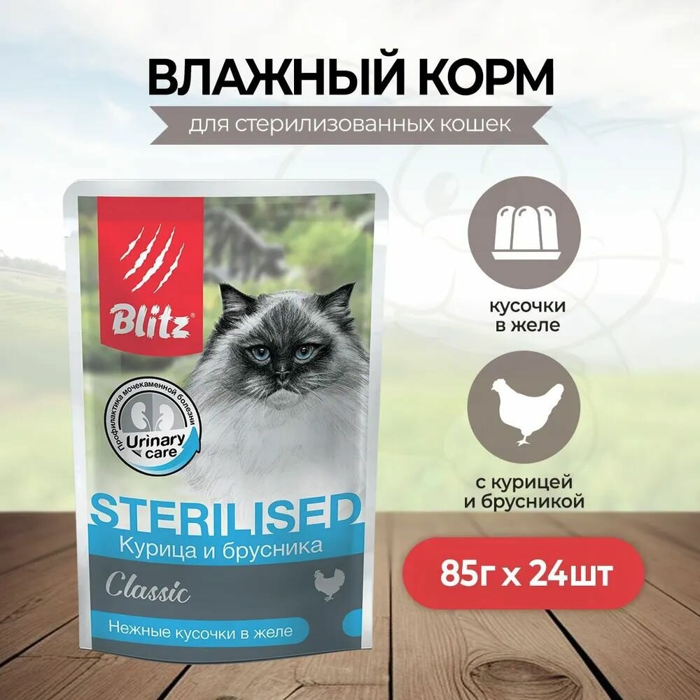 Влажный корм для кошек Blitz Classic Sterilised курица и брусника, в желе,упаковка 24 шт х 85 гр