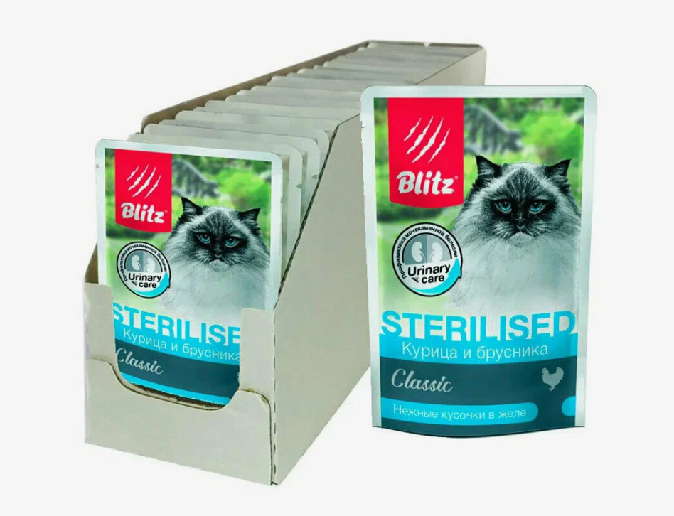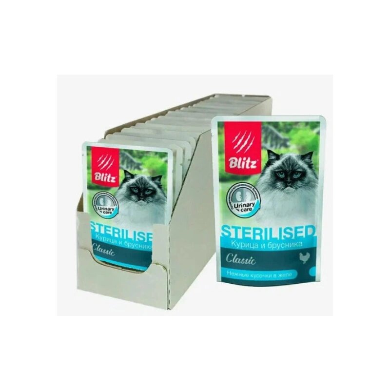 Корм Blitz Classic Sterilised (в желе) для стерилизованных кошек, курица и брусника, 85 г x 24 шт