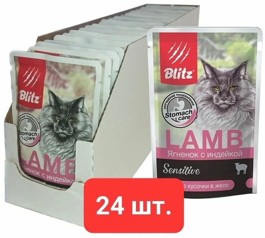 BLITZ SENSITIVE для взрослых кошек с чувствительным пищеварением с ягненком и индейкой в желе (85 гр х 24 шт)