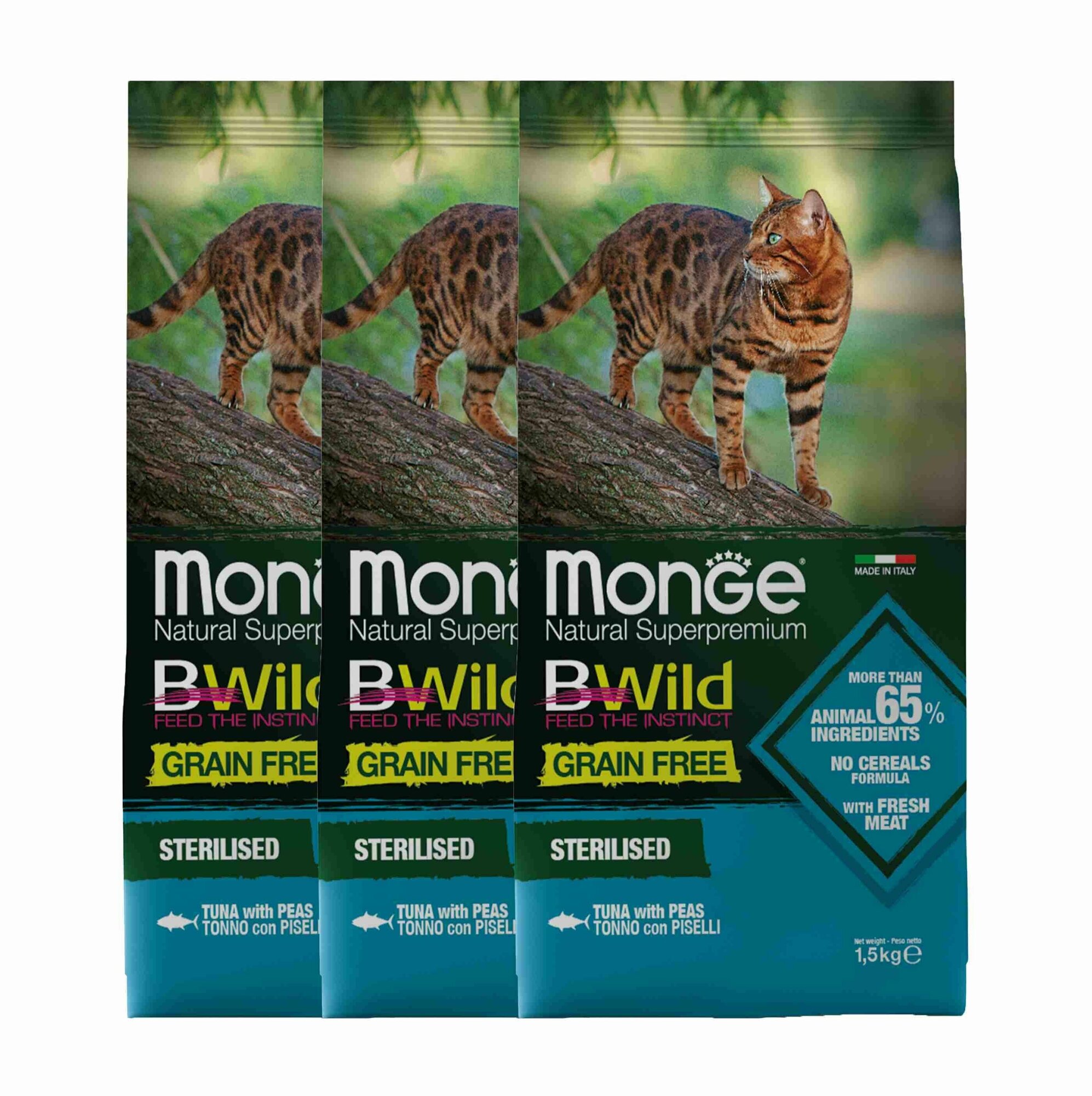 Купить Сухой корм для стерилизованных кошек Monge BWILD Feed the Instinct, с тунцом, с горошком 3 шт. х 1.5 кг