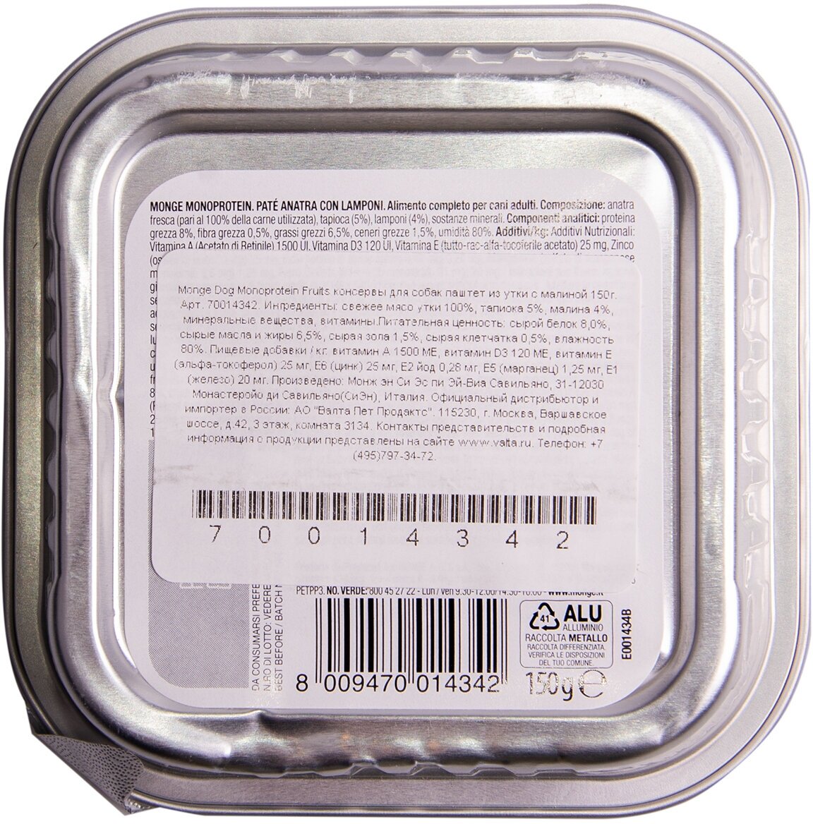Влажный корм для собак Monge Dog Monoprotein ANATRA con LAMPONI, беззерновой, утка, с малиной, 150 г